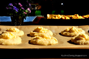 - Ciasto wyłożyć na oprószony mąką blat, będzie bardzo klejące. Można podsypać mąką na tyle aby nie lepiło się bardzo do rąk. Uformować z ciasta kulę. Oddzielać porcję ciasta (najlepiej nożem lub kuchenną łopatką) lekko zwilżonymi wodą rękami formować z ciasta kulki, układać na blasze wyłożonej papierem do pieczenia. Kiedy całe ciasto już wykorzystamy, każdą kulkę rozpłaszczyć, łyżką zanurzoną w wodzie, uformować niewielkie ,,gniazdko” na środku, do którego włożymy później budyń.