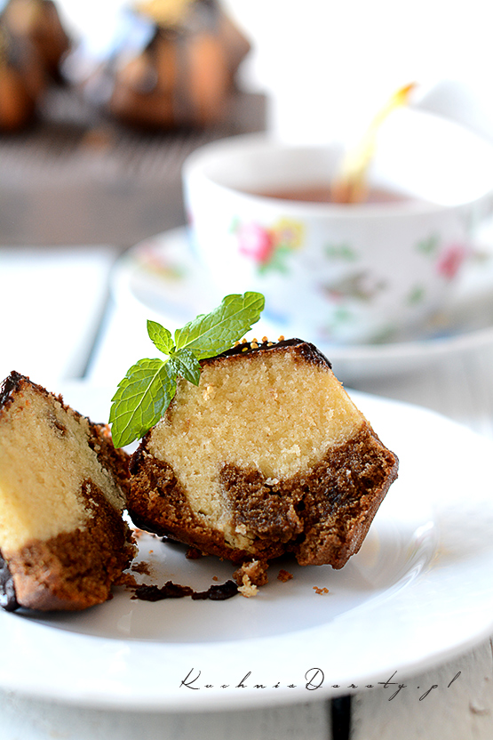 Foremki napełniamy po połowie ciastem waniliowym i kawowym.