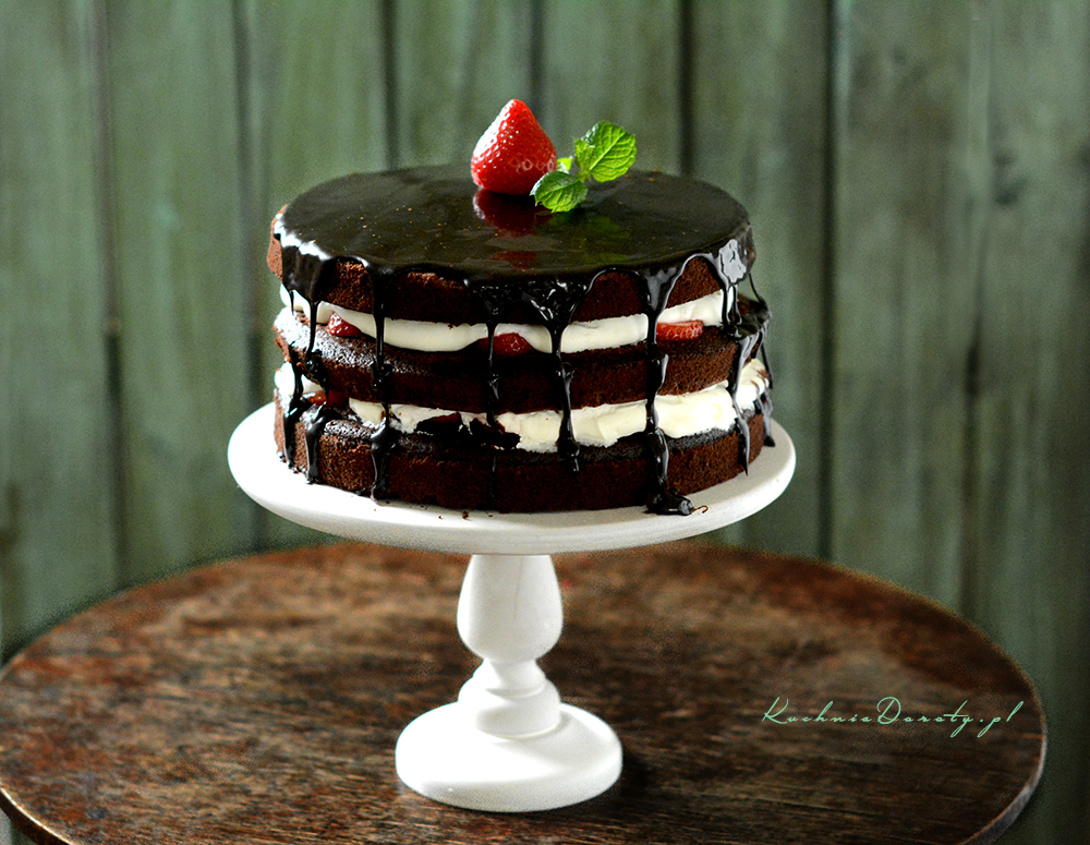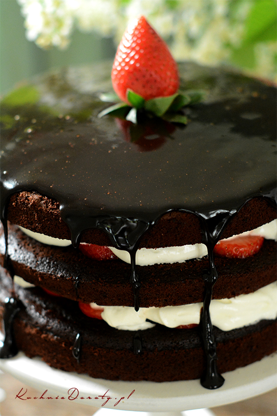 Ciasto polewamy chłodną polewą, pozwalamy czekoladzie spływać na boki.
