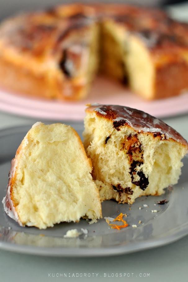 Niezwykle delikatne i puszyste ciasto drożdżowe. Pachnie niesamowicie skórkami z cytrusów. Znakomicie nadaje się do krojenia jak i odrywania sporych kawałków ciasta. Dodatek gorzkiej czekolady sprawia, że nie jest bardzo słodkie. Dla mnie pyszne.