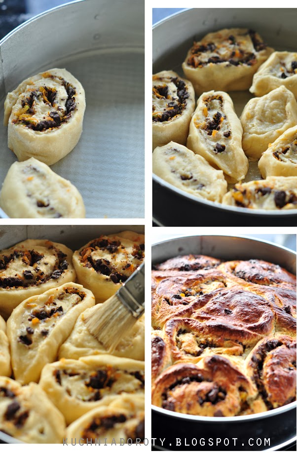 - Na ciasto wykładamy przygotowane nadzienie. Zwijamy w rulon. Przy pomocy noża dzielimy na ok. 10 równych plastrów.