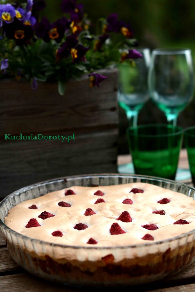 - Na podpieczone ciasto wykładamy rabarbar, na rabarbarowe nadzienie nakładamy pianę i wyrównujemy. Na wierzch możemy położyć kilka malin lub wydrylowanych wiśni.