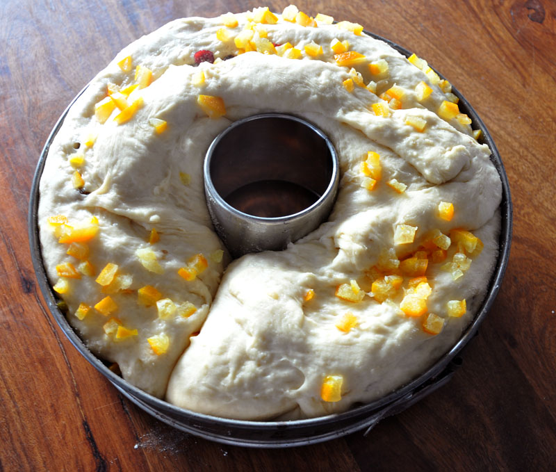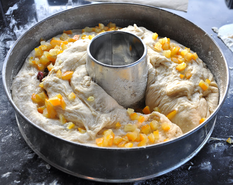 7. środek ciasta polać miodem, posypać cukrem, orzechami, rodzynkami, żurawiną i skórką pomarańczową. Pozostawić z każdej strony ok. 5 cm. czystego ciasta bez bakalii.