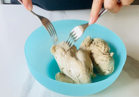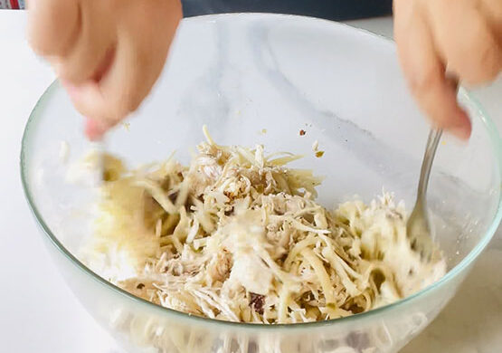 Kurczaka ugotowanego lub pieczonego, u mnie piersi gotowane w rosole, szarpię na ,,strzępki”.