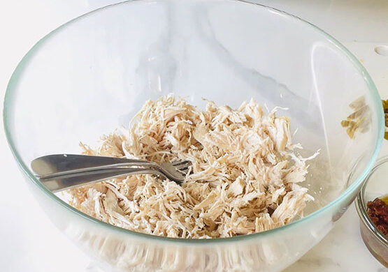 Kurczaka ugotowanego lub pieczonego, u mnie piersi gotowane w rosole, szarpię na ,,strzępki".