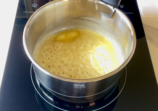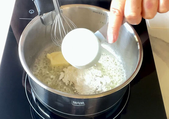 W garnuszku rozpuszczam masło (na małym ogniu). Wrzucam mąkę, mieszam i podsmażam przez 2-3 min.