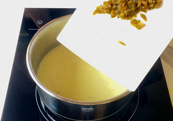 Następnie bulion i mieszam, cały czas podgrzewam. Po chwili dodaję posiekane jalapenio, doprawiam solą, pieprzem i gałką muszkatołową.