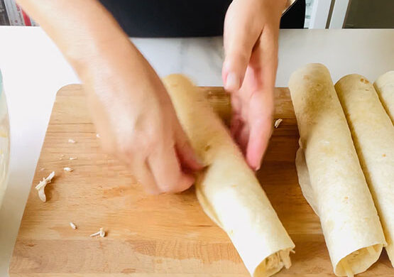 Na placku tortilli kładę porcję nadzienia i zwijam placek w rulon. W ten sam sposób postępuję ze wszystkimi tortillami i nadzieniem.