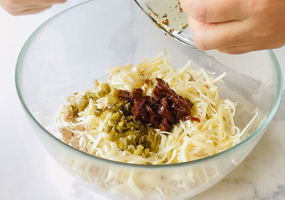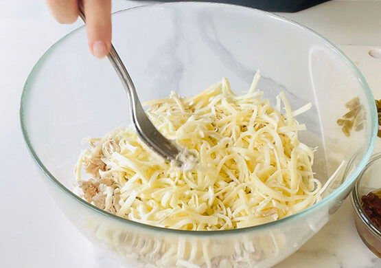 W dużej misce łączę kurczaka, starty ser, jalapenio i pomidory. Doprawiam solą i pieprzem. Mieszam dokładnie.