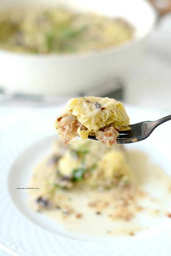 Dodajemy grzyby podsmażone z cebulą, mieszamy.