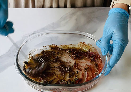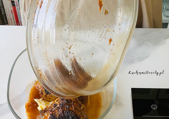 Mięso bardzo dokładnie obtaczam w marynacie. Przykrywam odstawiam do lodówki na noc.
