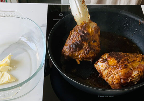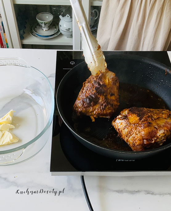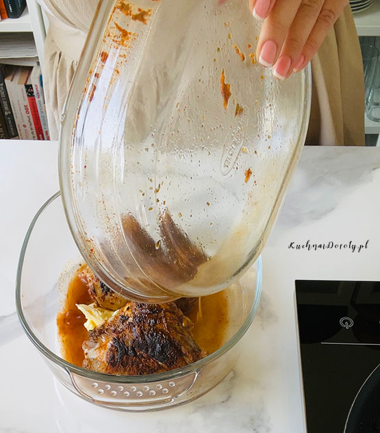 Indyka przekładam do naczynia żaroodpornego, dodaję masło, wrzątkiem opłuję miskę z marynatą i wlewam do naczynia.