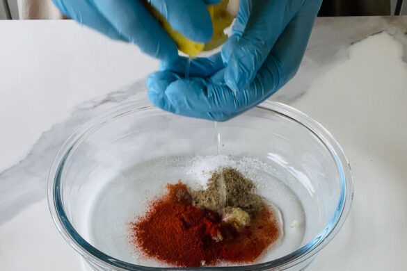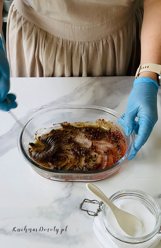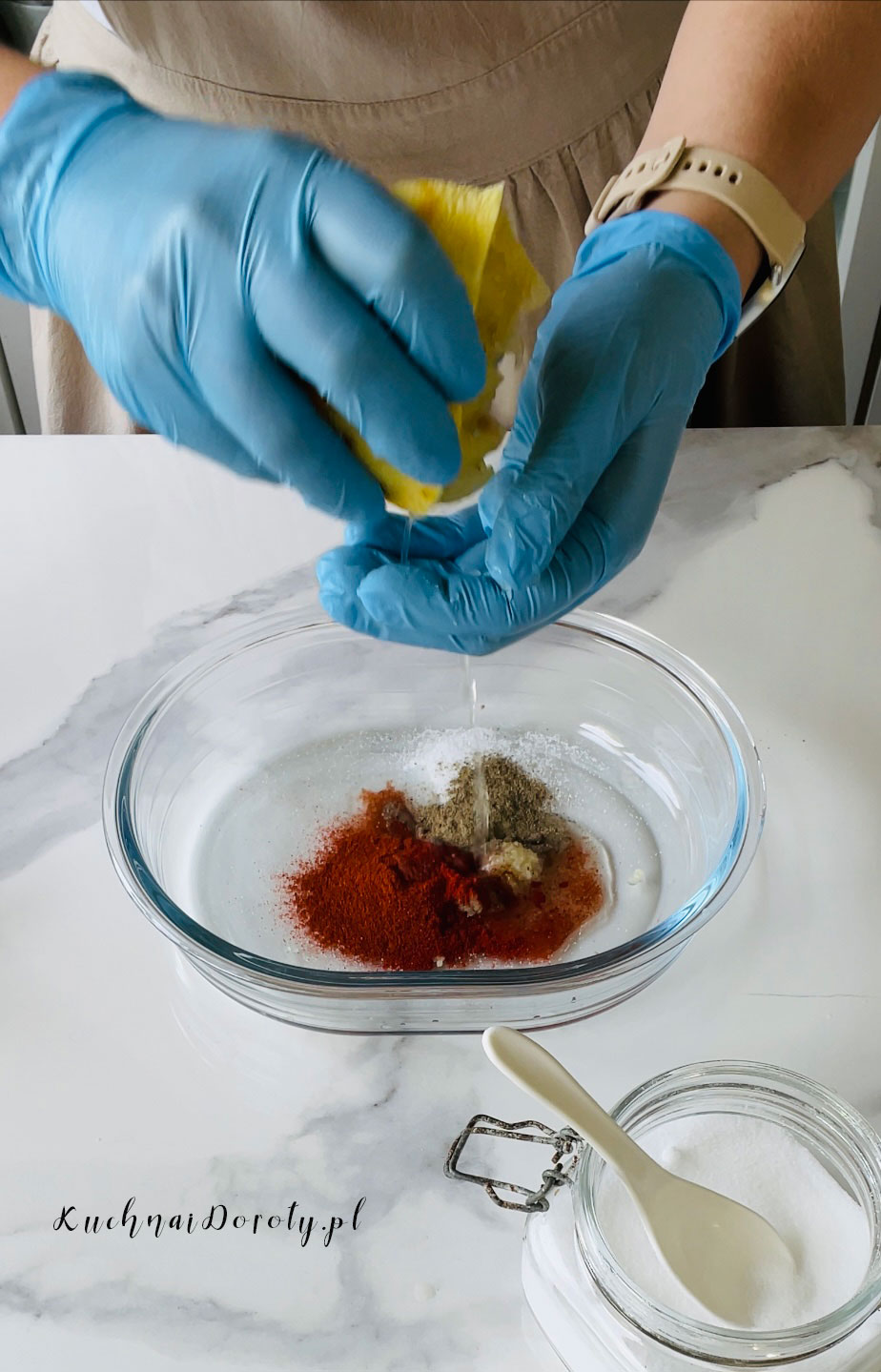 W naczyniu łączę oliwę ok. 2-3 łyżek, sól, pieprz, papryki, sok z cytryny, majeranek i czosnek przeciśnięty przez praskę.