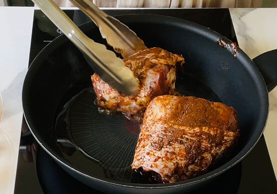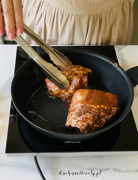 Na patelni rozgrzewam odrobinę oliwy, kiedy jest gorąca obsmażam na niej golonki. Z każdej strony, aż mięso będzie bardzo zrumienione.