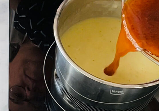 Dolewam sos z pieczenia golonek. Mieszam i podgrzewam przez 2-3 min, na maleńkim ogniu. Sos ma tylko ,,mrugać”.
