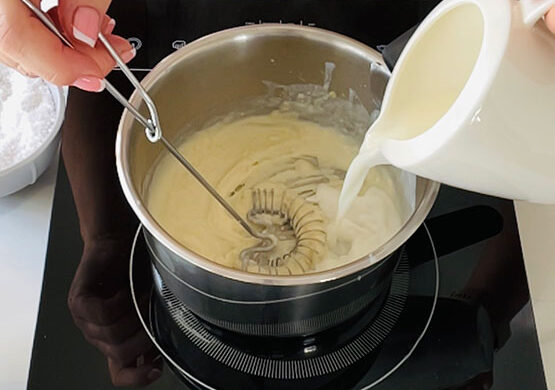 Następnie do garnuszka partiami wlewam mleko i od razu intensywnie mieszam. Sos bardzo szybko gęstnieje, więc ogień musi być średni i trzeba mieszać (kuchenna rózga będzie najlepsza)