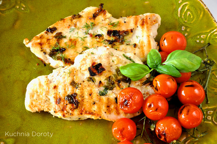 grillowane piersi kurczaka to mój ulubiony sposób na kuraka. Polewam go sosikiem dopiero na talerzu, aby podczas pieczenia na patelni grillowej nie dymił, ale jak się robi na grillu na zewnątrz, to chyba nie ma większego znaczenia.