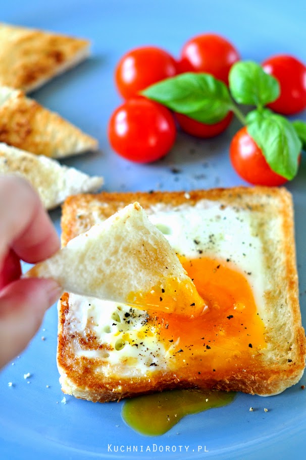 Jeśli lubimy dobrze ścięte jajka, po 2 min przewracamy kromki na drugą stronę i smażymy przez chwilę.