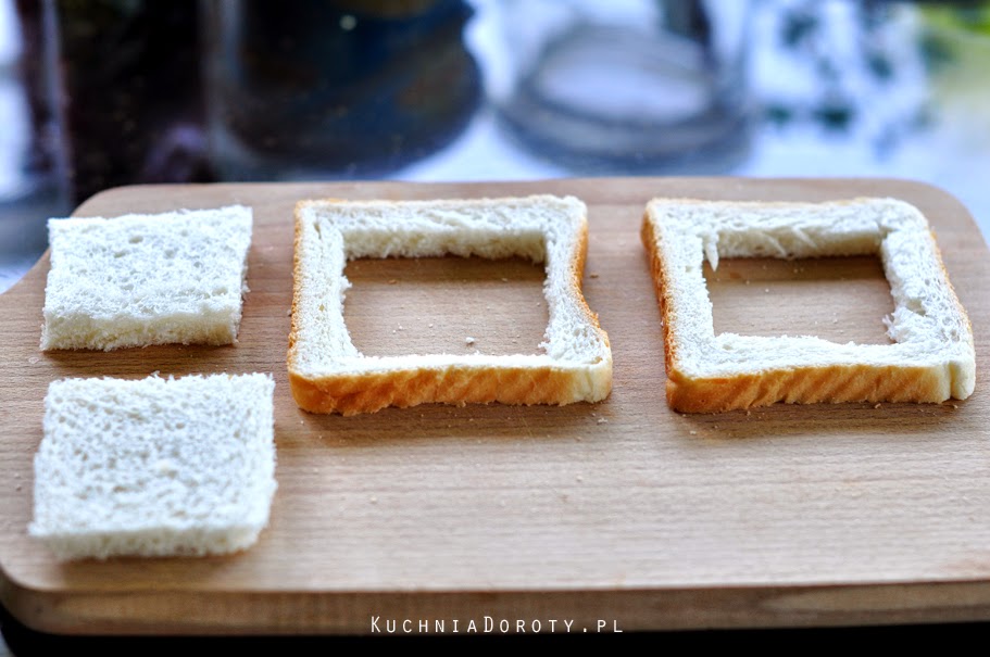 Na patelni rozgrzewamy masło, układamy chleb (kromki z dziurą) podsmażamy do zrumienienia, przekładamy na drugą stronę i w miejsce dziury wbijamy po jednym jajku. Lekko solimy.