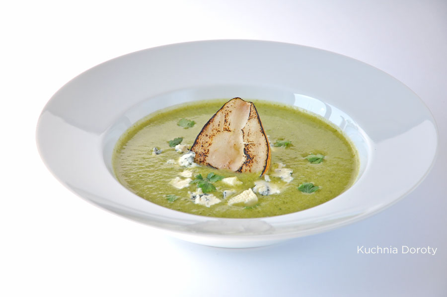 Prosta, szybka i bardzo pyszna zupa krem z brokułów. Odpowiednia na elegancki obiad lub kolację. Pomysł na grillowaną gruszkę podpatrzyłam u Gordona Ramsaya, owoc powinien być naprawdę bardzo dojrzały, bo tylko taki będzie można z łatwością pokroić łyżką.