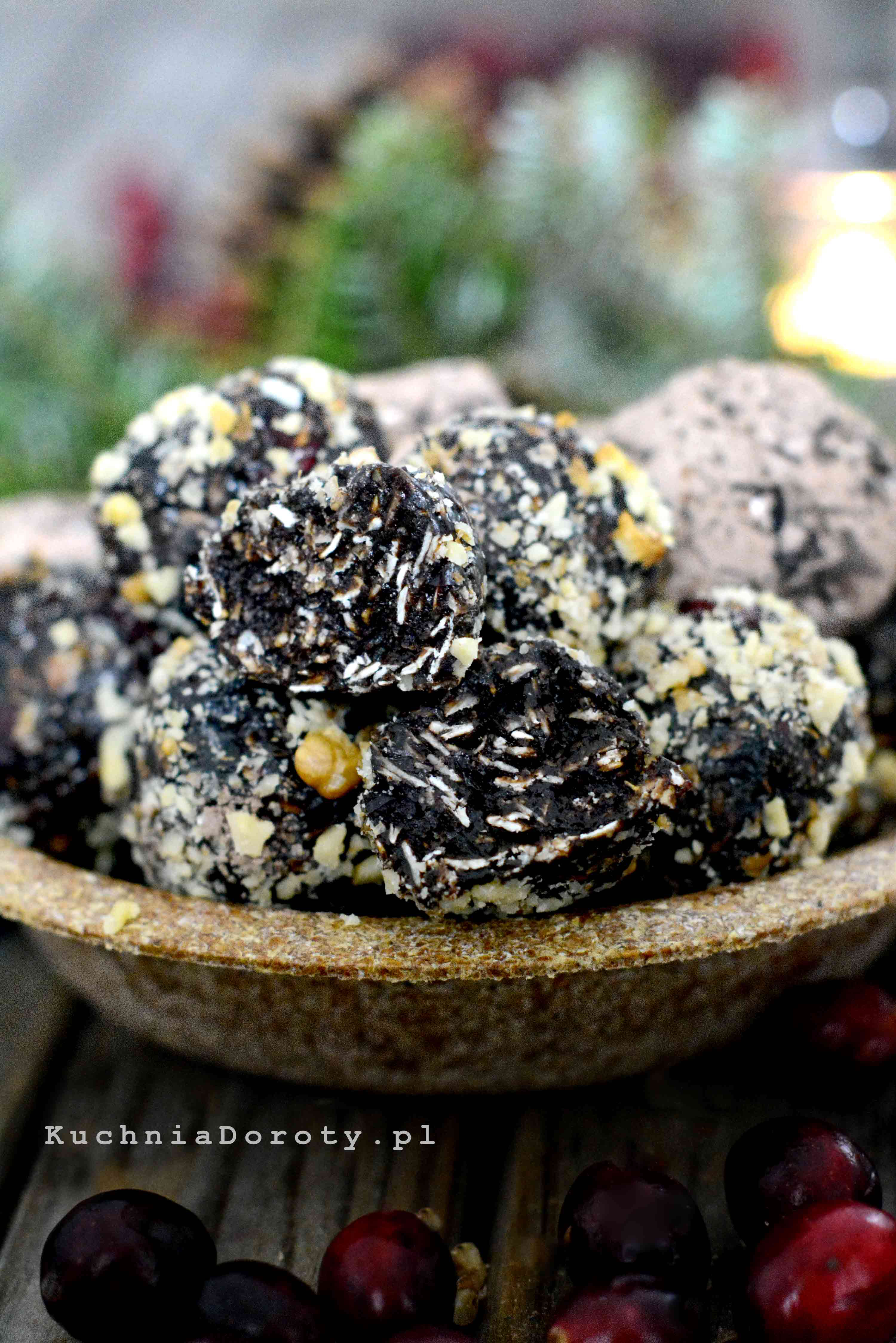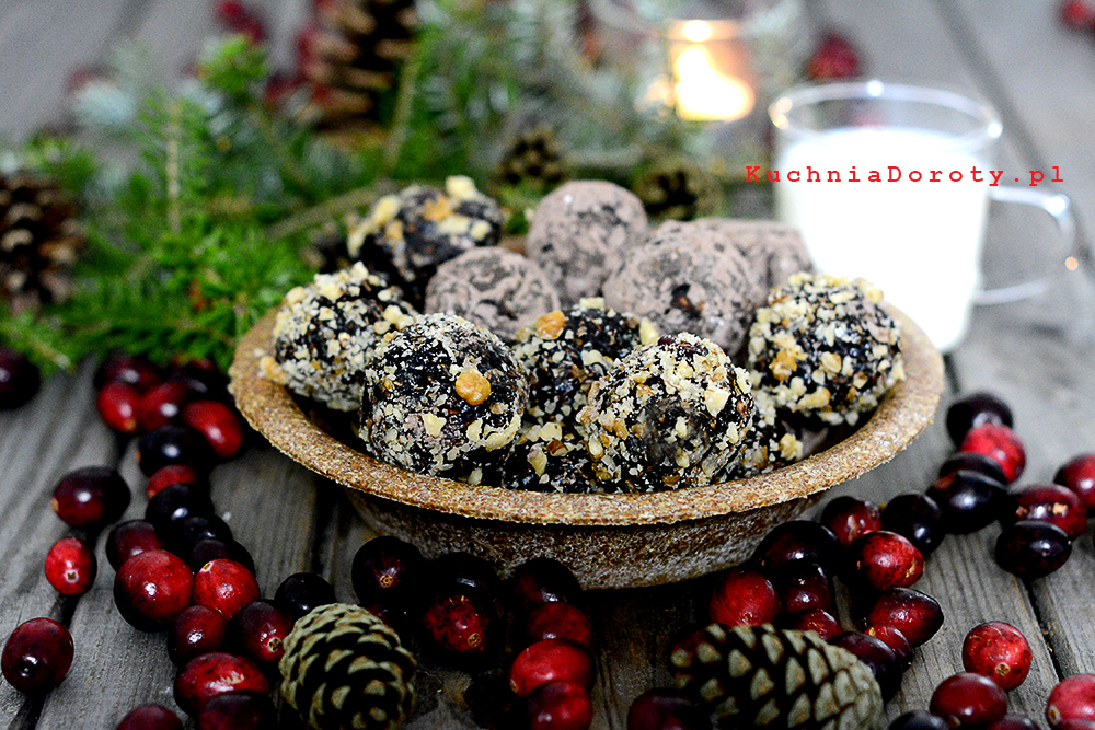 Każdą kulkę obtaczamy w siekanych orzechach, lub w mieszance cukru pudru i kakao.