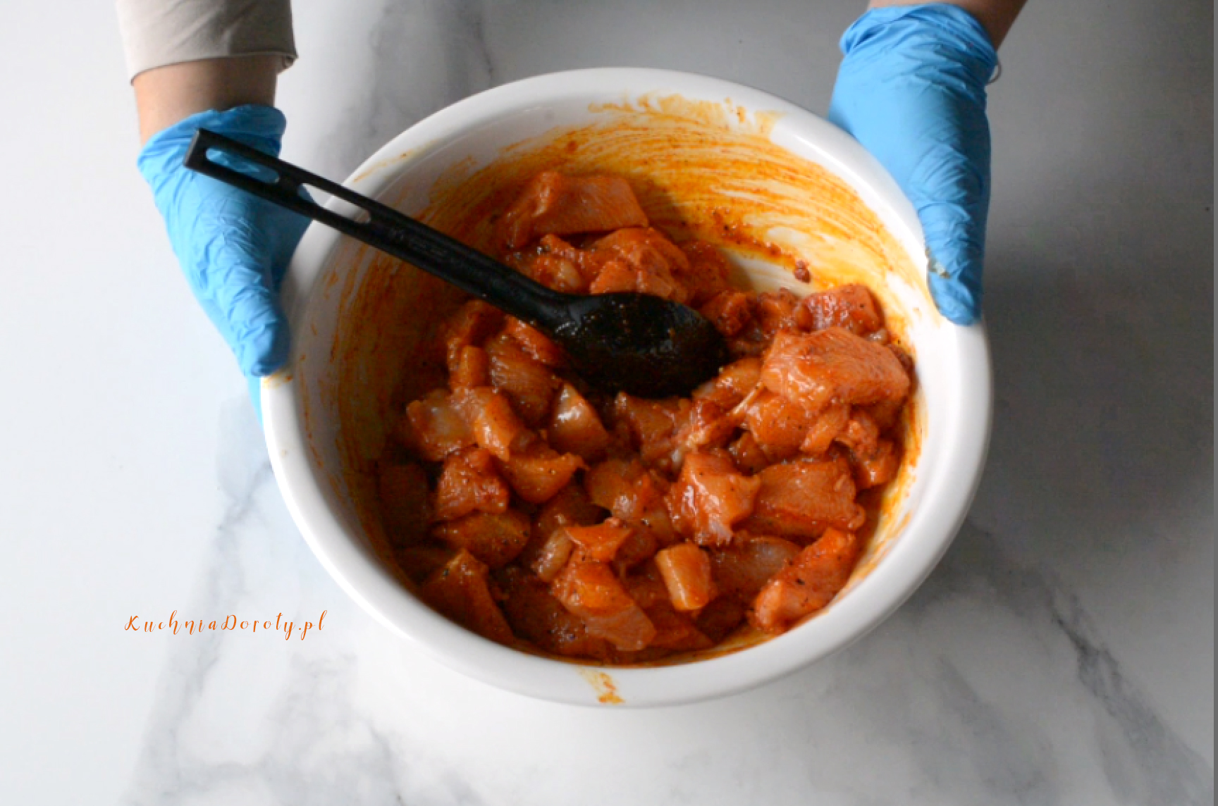 Kurczaka myję, czyszczę z tłuszczu i żyłek. Piersi kroję w kostkę średniej wielkości. Z przypraw robię marynatę, w misce łączę sól, pieprz, papryki i czosnek, mieszam.