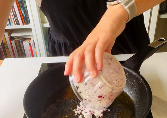 Sos po za serem i pomidorami bogaty jest również w dwukolorową cebulę. Najczęściej do przygotowania sosów używam szalotki, ale tutaj zdecydowałam się na cebulę białą i czerwoną, dzięki temu sos ma piękny głęboko złoty kolor.
