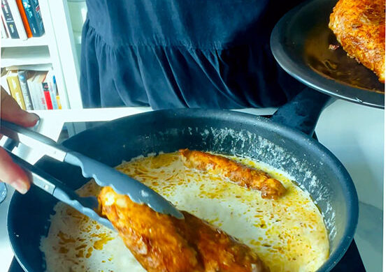 Zmniejszam płomień i na patelnię wkładam obsmażone piersi kurczak.