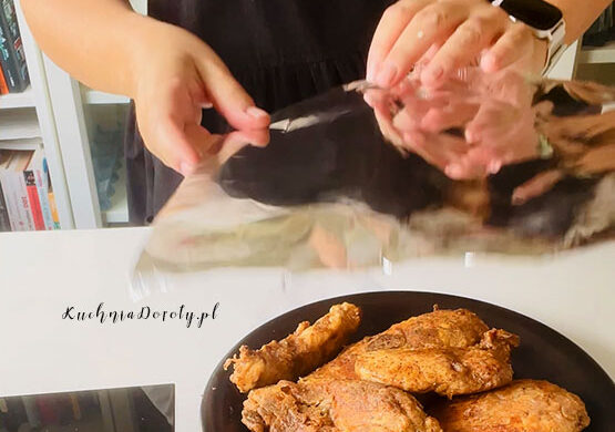Kurczaka wyjmuję z lodówki, odkrywam. Obtaczam w mące.