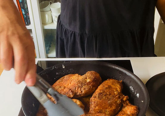 Kurczaka wyjmuję z lodówki, odkrywam. Obtaczam w mące. Na patelni rozgrzewam olej i na nim obsmażam mięso, aż będzie rumiane.