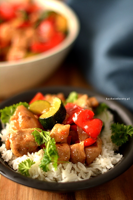 Kurczak jest bardzo aromatyczny i intensywny w smaku, pyszny. Bardzo polecam nie tylko na rodzinny obiad, ale i na kolację ze znajomymi. Dla dorosłych warto przygotować nieco ostrzejszą wersję, a jeśli danie mają jeść dzieci możecie w ogóle zrezygnować z ostrych dodatków.