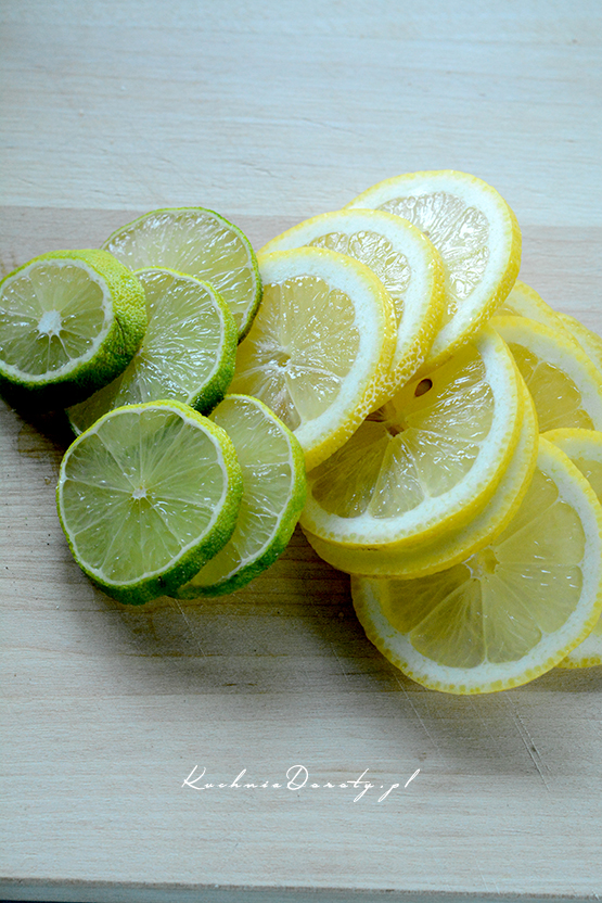 Cytrynę i limonkę dokładnie wyszorować, pokroić w średniej grubości plasterki.