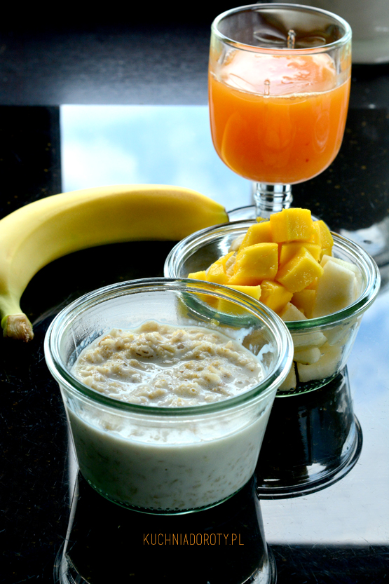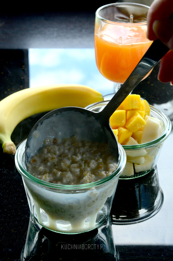 Ta owsianka jest raczej wytrawna i jedynym słodkim akcentem są owoce, nie dodaję cukru ani miodu. Szczypta soli sprawia, że owsianka nie jest mdła.
