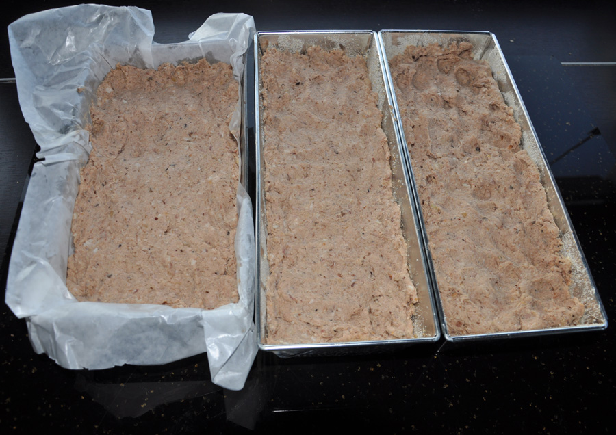- Masę dzielimy na trzy równe części, rozkładamy do foremek keksowych posmarowanym masłem i wysypanych tartą bułką lub wyłożonych papierem do pieczenia. Wygładzamy masę i w zależności od upodobań możemy na wierzch położyć, cieniutkie paseczki słoniny, śliwki wędzone, żurawinę.