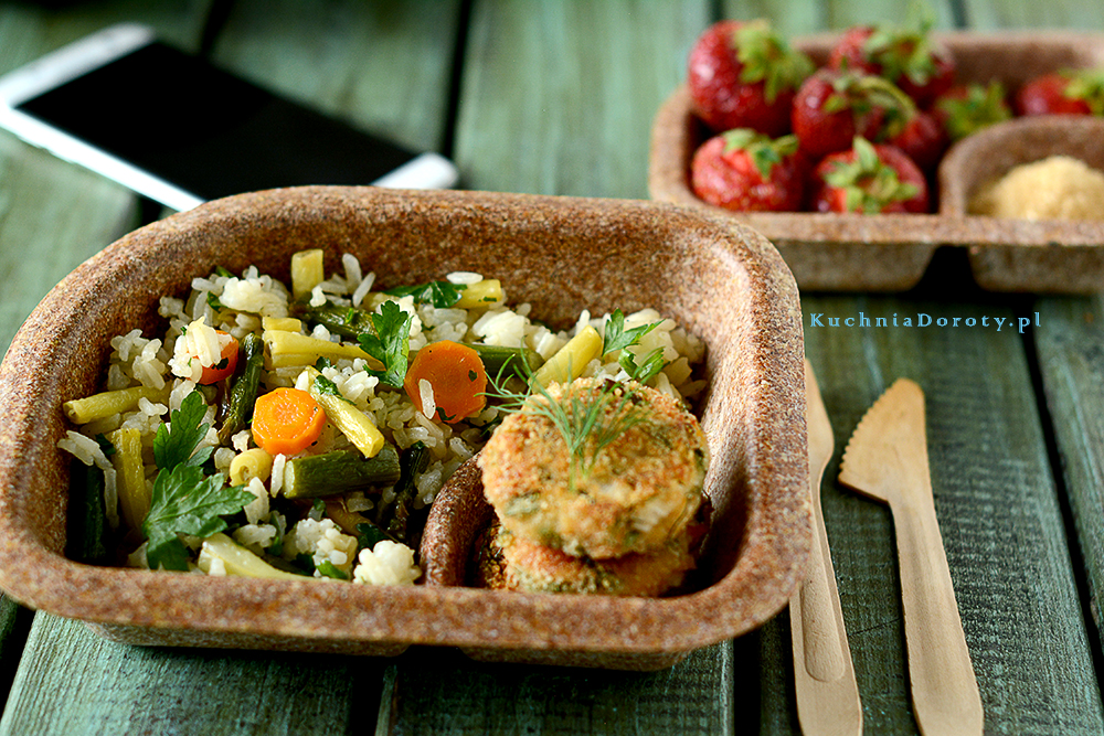 Nie musimy gotować niczego skomplikowanego. Lunch da się zrobić nawet z kilku prostych składników. Jestem tu, żeby Was wspierać więc chętnie sama coś zaproponuję. Spojrzałam na sprawę… sezonowo i wykorzystałam m.in. warzywa, które właśnie rosną – wybrałam ryż z karmelizowanymi młodymi warzywami i miodowym sosem, a do tego placuszki z wędzonego łososia. To danie można podawać na zimno i na gorąco, co w biurowych warunkach może być istotne.