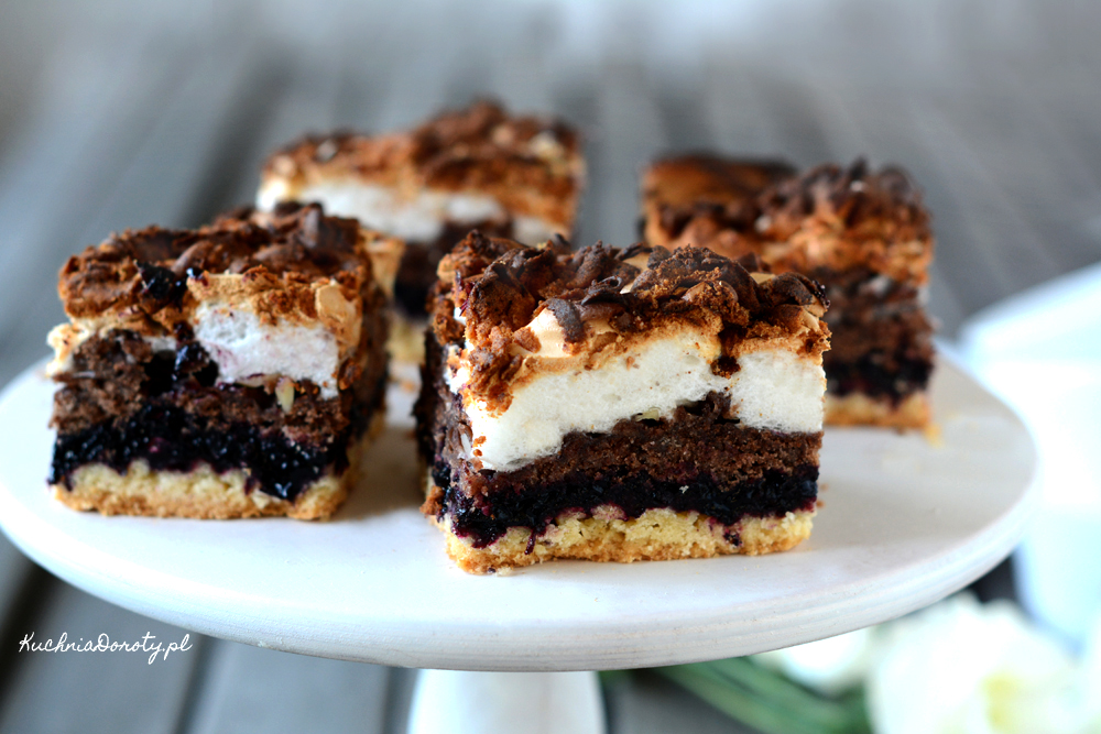 Kolejna warstwa to piana z białek, a na koniec posypujemy ciasto grubo startym ciastem jasnym