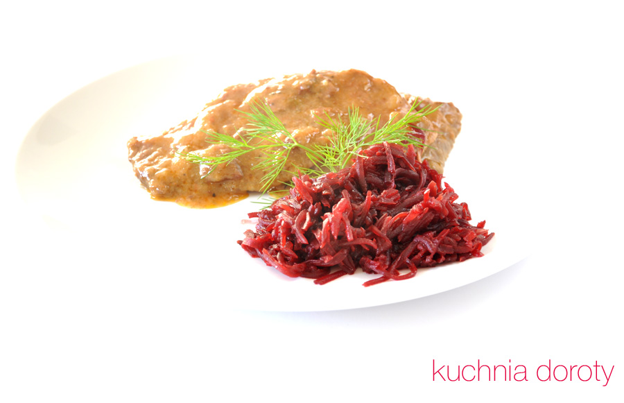 U nas dzisiaj były bitki z pure ziemniaczanym i buraczkami na ciepło. Tadzio nie jada buraków, więc dostał marchewkę z jabłkiem.