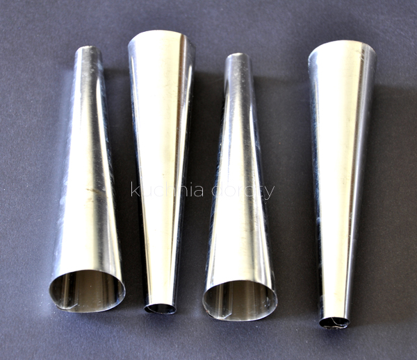 Pokroić ostrym nożem na ok. 5 cm pasy. Ciasto w miarę możliwości ścisło, nawinąć na rurki, zaczynając od cieńszego brzegu.