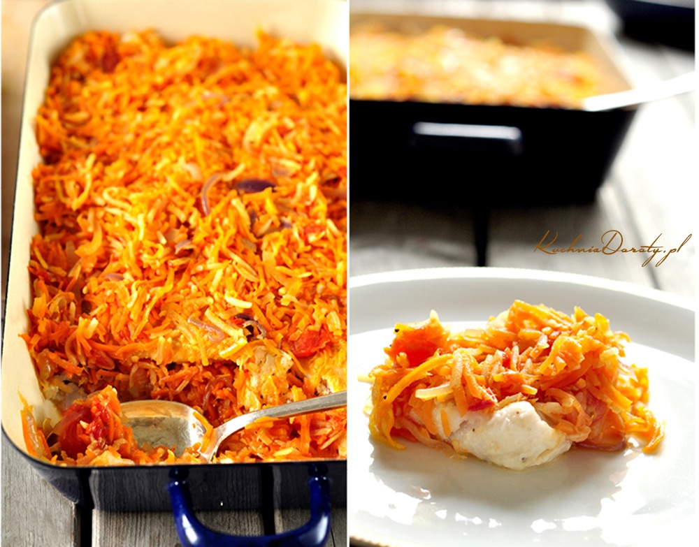 Warstwę dorsza przykryć połową duszonych warzyw, następnie ułożyć następną warstwę i ponownie przykryć warzywami.