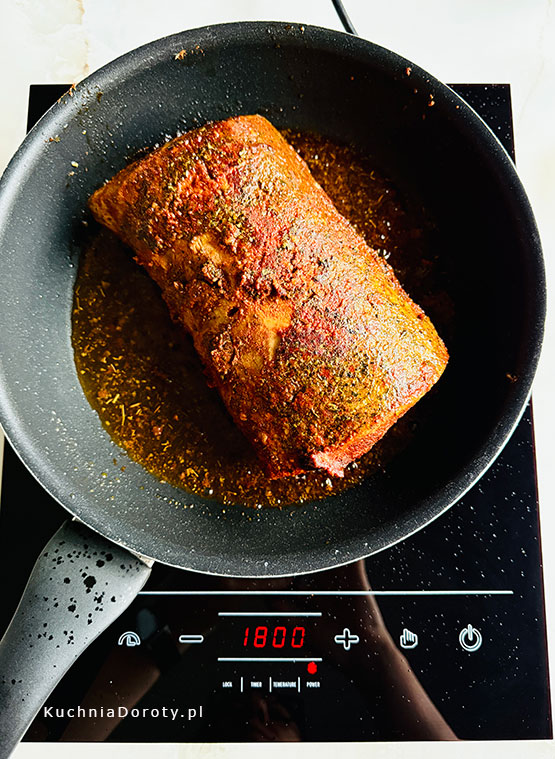 - Aby schab był soczysty nie możemy zapomnieć o obsmażeniu mięsa przed pieczeniem. Nie ważne czy pieczecie mięso w rękawie, czy w naczyniu żaroodpornym. KONIECZNIE mięso trzeba wcześniej obsmażyć i to bardzo dokładnie. Na rozgrzanym oleju lub oliwie z każdej strony smażycie schab do zrumienienia. uważacie aby się nie spalił, ale na pewno smażenie powinno być dość intensywne. Pomagamy sobie szczypcami lub długim widelcem i z każdej strony zamykamy mięso, dzięki temu w czasie pieczenia sok ze schabu zostanie w mięsie a ono nie będzie suche.