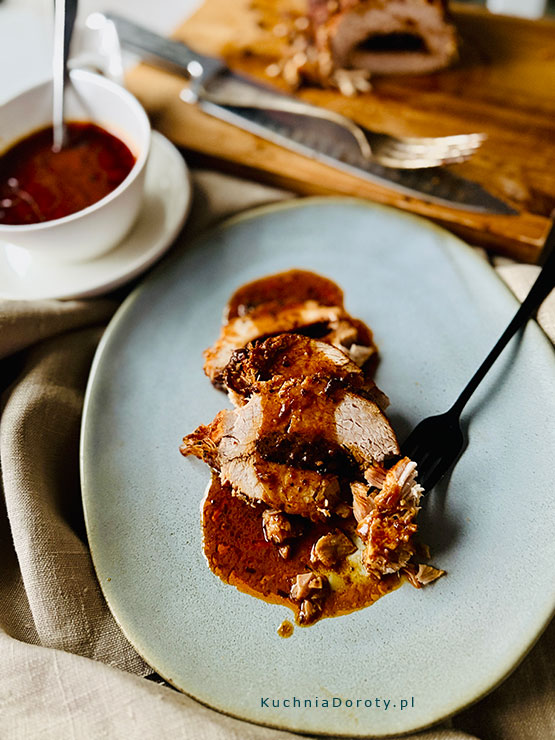 Schab, choć bywa suchy, w moim wydaniu jest niezwykle soczysty i miękki. Sekretem jest pieczenie go w rękawie do pieczenia, co gwarantuje, że mięso zachowuje wszystkie soki. Ale to nie wszystko. Całości dopełnia idealny sos pieczeniowy, który nie tylko podkreśla smak, ale też dodaje mięsu dodatkowej wilgoci. Do nadzienia używam suszonych śliwek – polecam te wędzone, które dają głęboki aromat, ale każde suszone śliwki będą pasować.