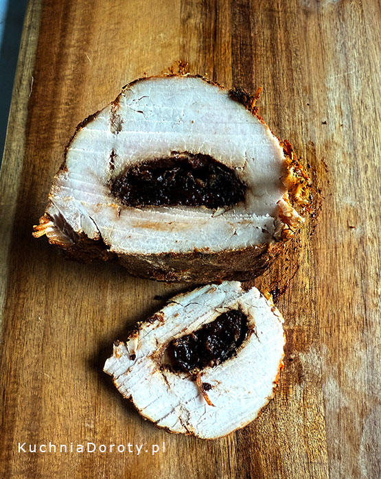 - Nadziewanie: Ważny element tego przepisu, czyli nadziewanie mięsa. Schab nacinam długim, wąskim i bardzo ostrym noże wzdłuż.