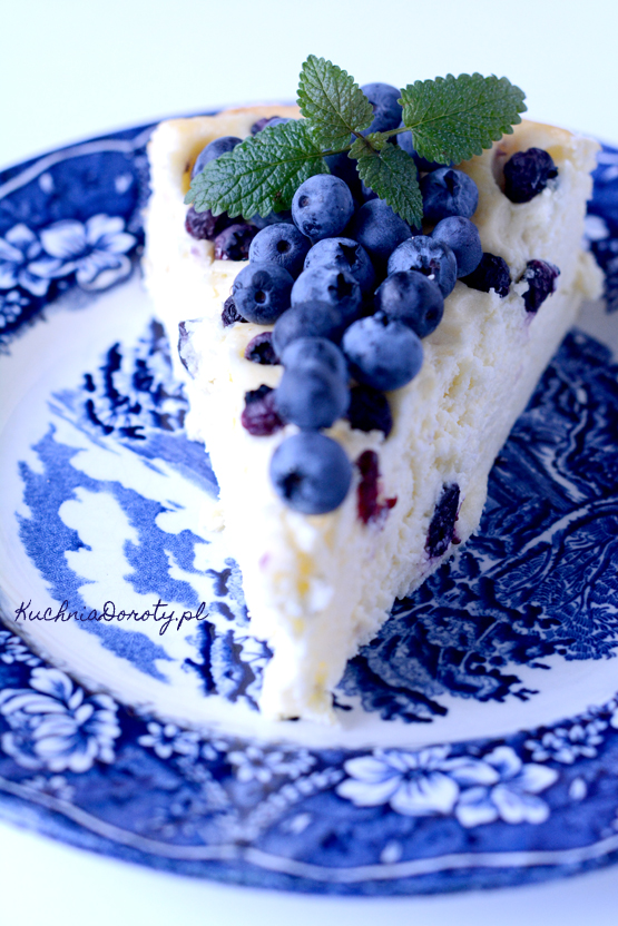 Dzięki tak długiemu czasowi pieczenia w niskiej temperaturze mamy pewność, że ciasto będzie upieczone i bardzo jasne, nie wyrośnie i nie popęka. No cóż, coś za coś. Jeśli sernik upieczecie dzień wcześniej i na noc zostawicie w chłodnym miejscu, będzie idealny, na koniec posypcie go tylko dodatkowo świeżymi borówkami, będzie pyszny.
