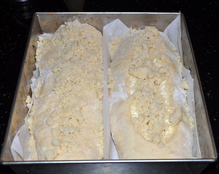 - Układamy na blasze lub w foremce wyłożonej papierem do pieczenia. Strucle nacinamy ostrym nożem do połowy głębokości ciasta. Odstawiamy na 20 min do lekkiego podrośnięcia. Posypujemy kruszonką.