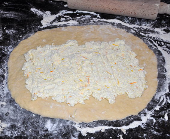 - Na każdy kawałek ciasta wykładamy połowę sera. Zwijamy.