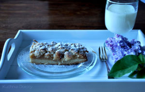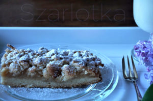 - Na podpieczony spód wykładamy jabłka i posypujemy przygotowaną kruszonką, wstawiamy do gorącego (170oC) piekarnika i pieczemy 20-25 min do zrumienienia ciasta.