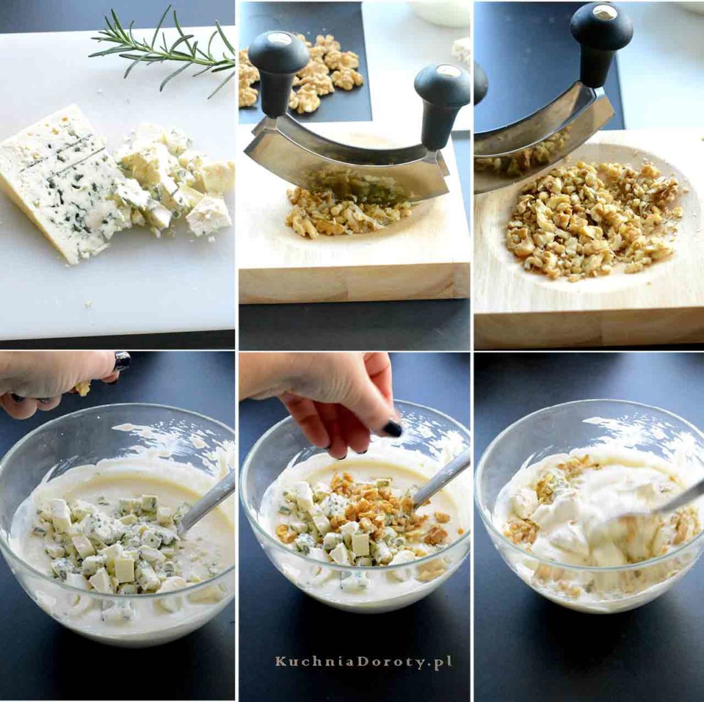 W misce połączyć śmietanę, jajko, pieprz i sól dokładnie wymieszać. Do maślanej masy dodać pokruszony ser pleśniowy i posiekane orzechy, wymieszać. Odstawić.