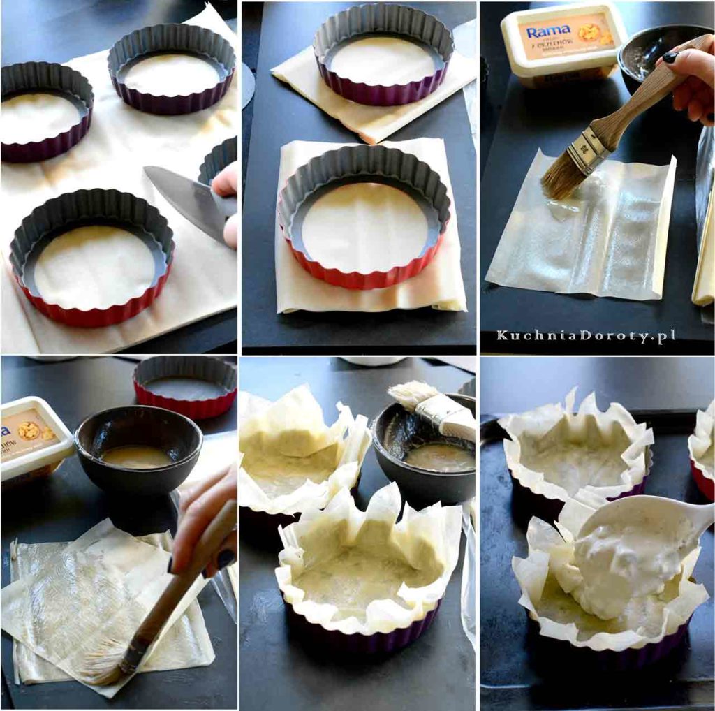 Ciasto filo pokroić na kwadraty nieco większe niż foremki. Każdy płatek ciasta filo smarować Ramą, układać na nim kolejny płat ciasta i ponownie smarować.