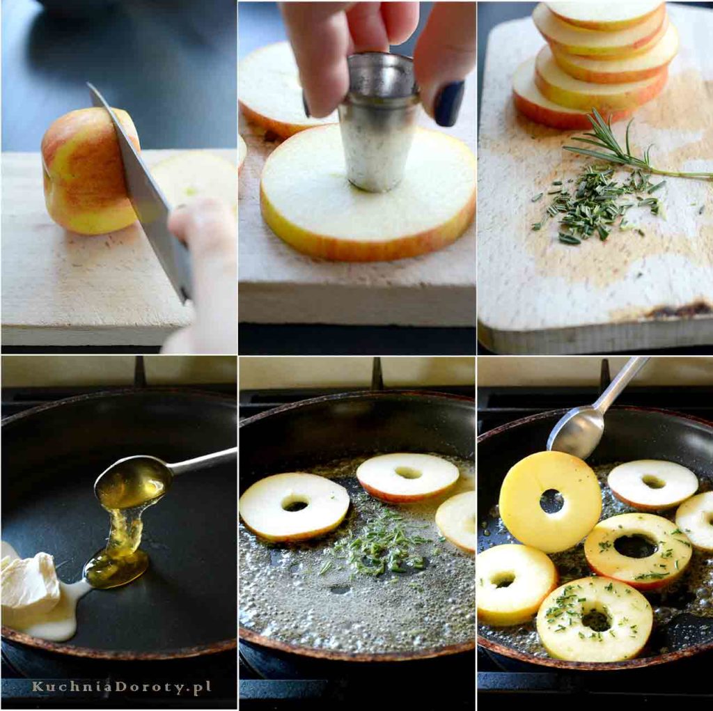 Na patelni rozgrzać Ramę i miód, dodać rozmaryn i kiedy tłuszcz się rozpuści ułożyć na nim jabłka. Smażyć na średnim ogniu po ok. 3 min z każdej strony. Jabłka powinny być dobrze nasączone karmelem. Zdjąć i odstawić.